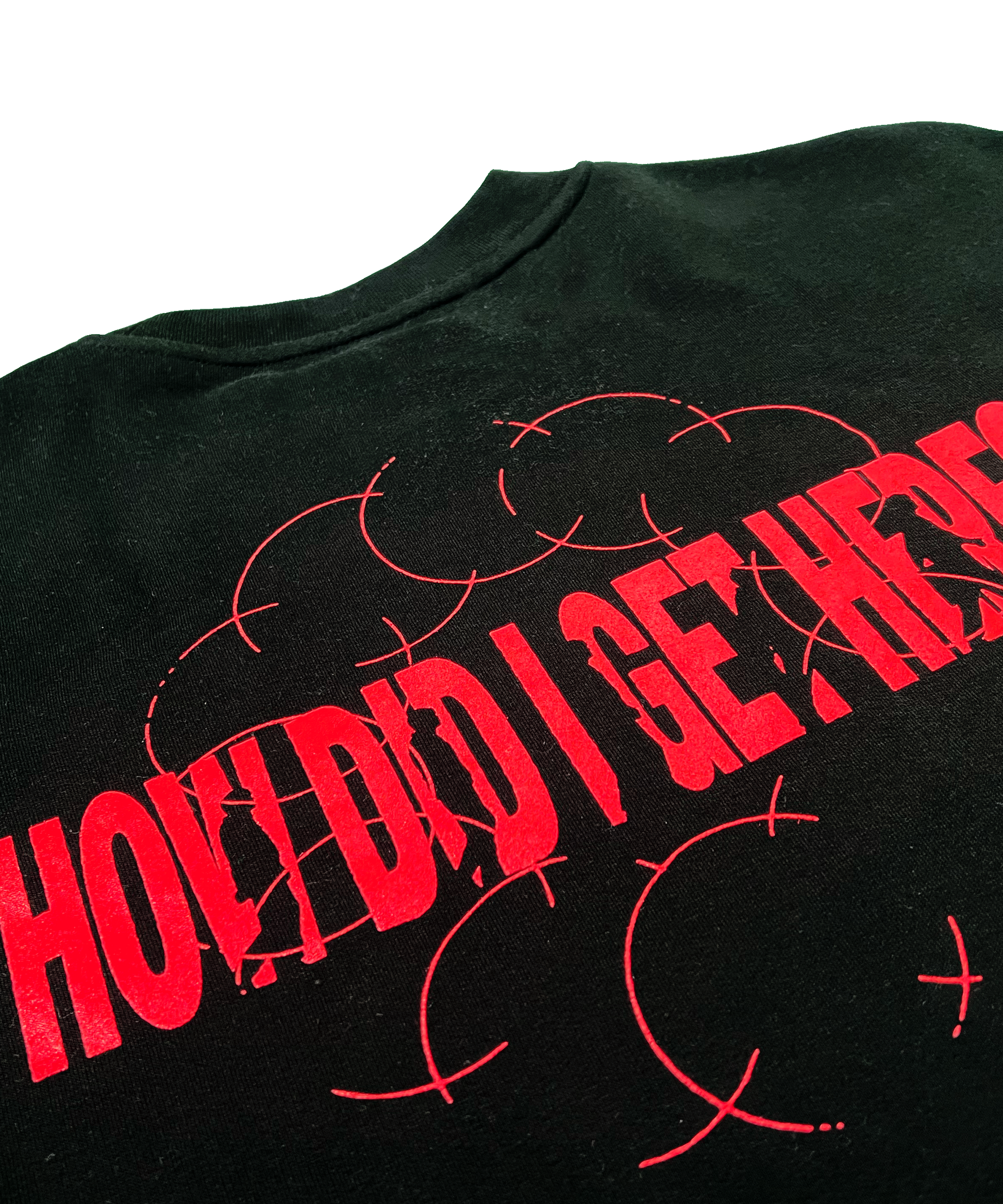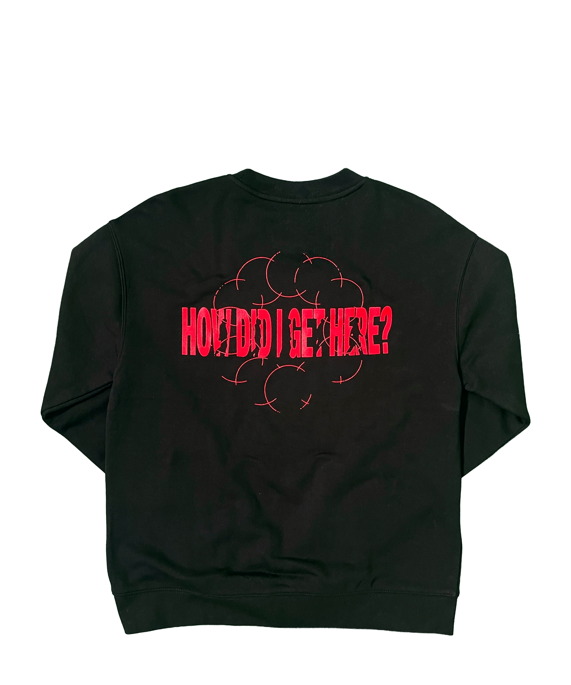 How Did I Get Here? relaxed fit black crewneck, crafted with a mid-weight 320gsm fabric blend of 80% cotton and 20% recycled polyester fleece to give a soft touch feel. Red album question mark printed as a front left chest piece, with album title artwork on the back. This crewneck is pre-shrunk to minimise shrinkage and features a dropped shoulder and sleeve cuff ribbing for a cosy, contemporary fit. Screen printed for a long lasting effect.