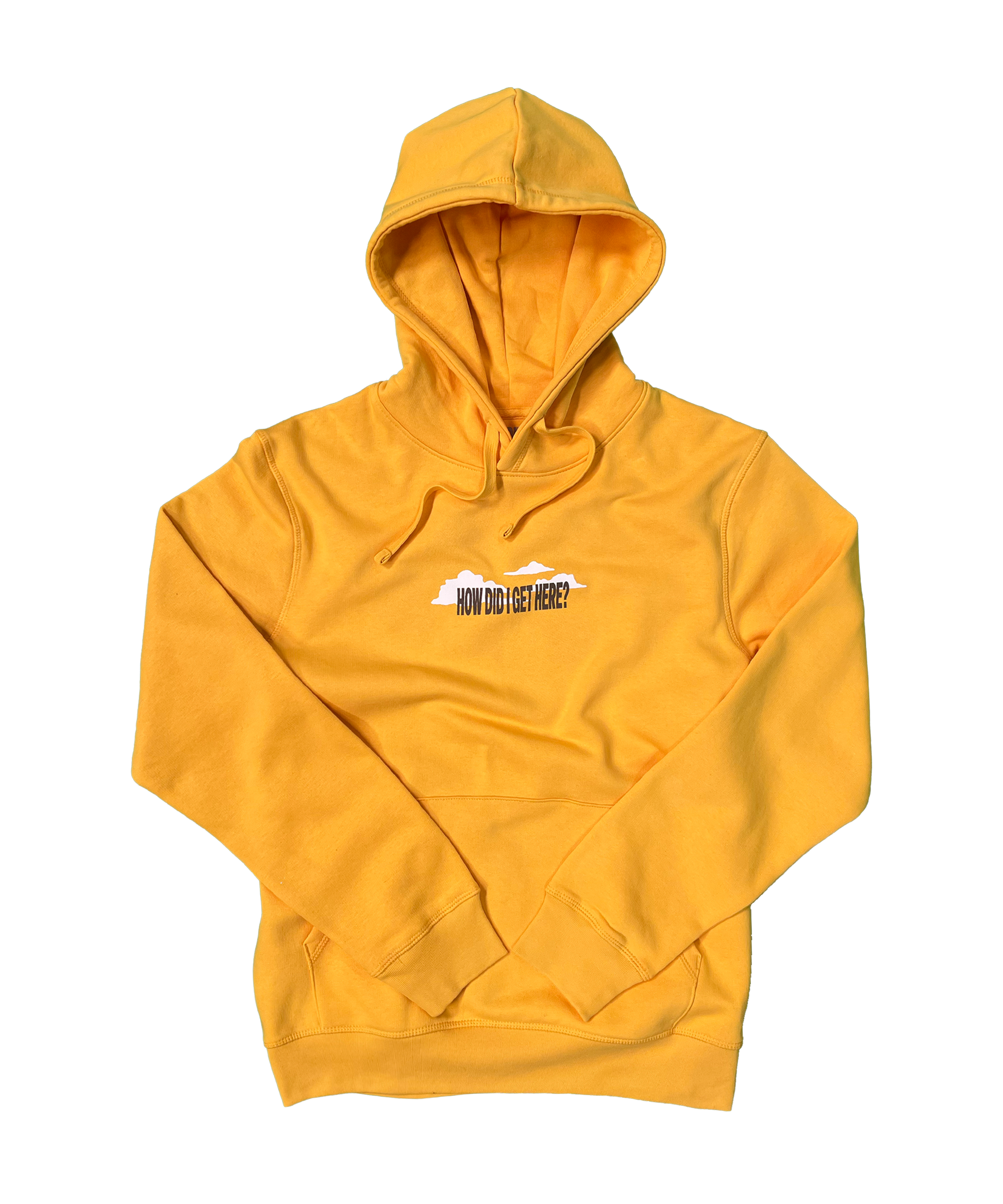 How Did I Get Here? album hoodie in vibrant yellow. Made with a reliable blend of 50% cotton and 50% polyester in 271gsm fabric. This hoodie features the album title as a front centre chest print and vibrant alternative album artwork printed on the back. The hood is double-lined for a quality finish. We recommend sizing up to wear oversized.