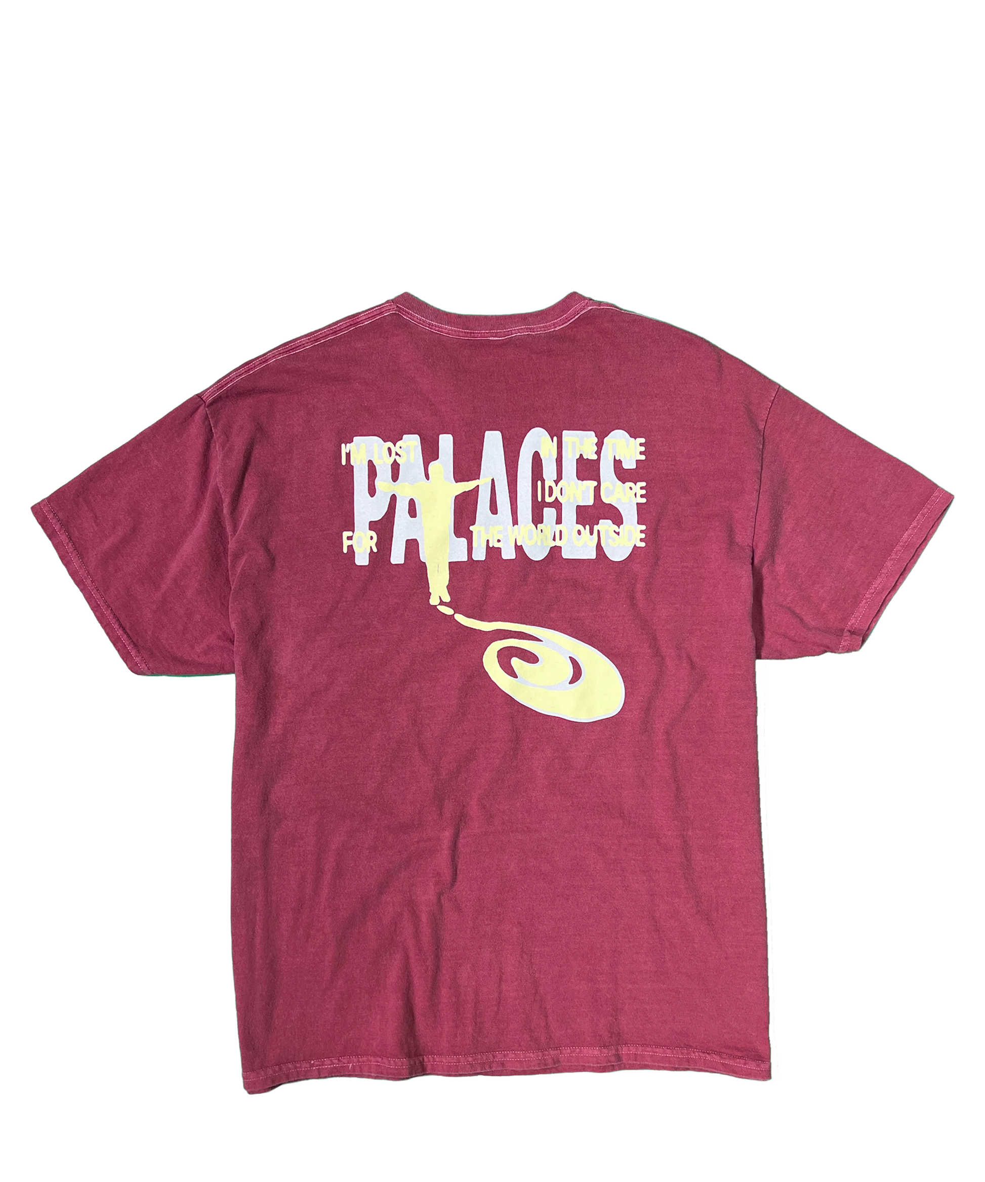 Palaces T-Shirt in red, crafted with 185gsm and 100% cotton fabric. This T-Shirt is printed front and back with album question mark over the front left chest and original lyric graphic on the back inspired by the single artwork. The top is pre-washed to reduce shrinkage and fits true to size. Soft touch for a premium feel.